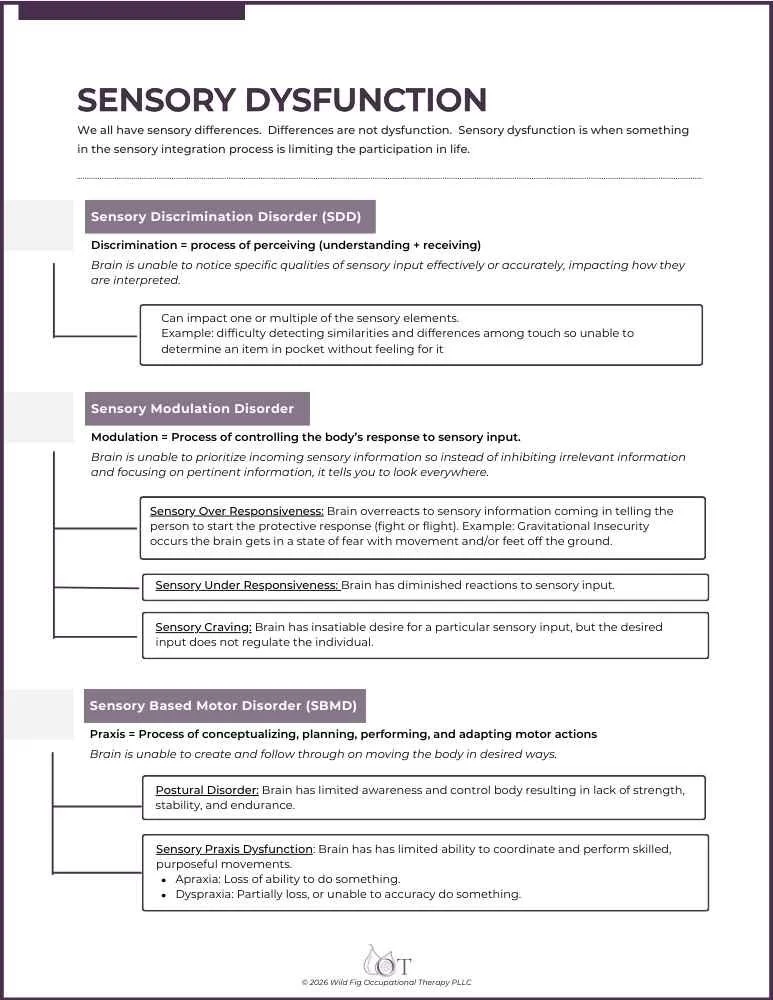We all have sensory differences. Differences are not dysfunction. Sensory dysfunction is when something in the sensory integration process is limiting the participation in life. This handout describes the 3 main types.